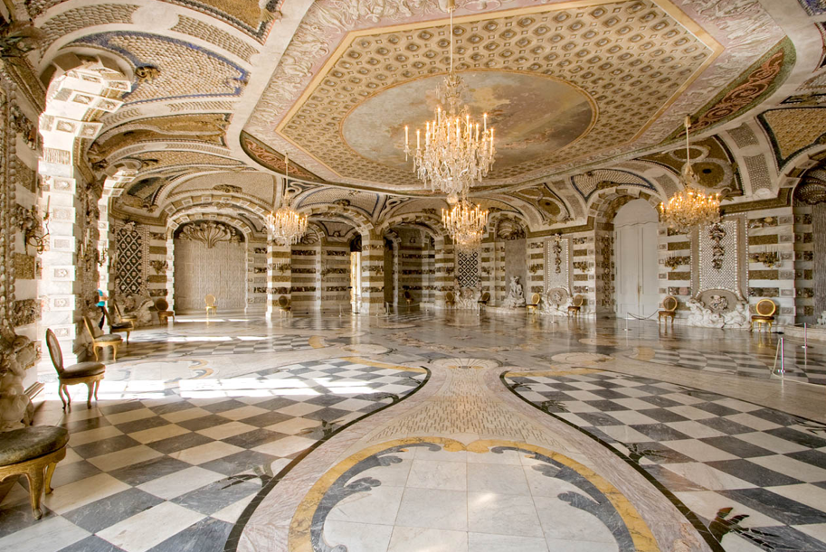 Interiorul este cu adevarat fascinant datorita somptuozitatii, cele mai maiestuoase camere fiind Sala de Marmura, Sala de concerte si Sala Grota care este absolut senzationala, toti peretii fiind decorati cu scoici, minerale si corali. Palatul are propriul teatru unde inca se mai tin spectacole, insa din pacate acesta nu este deschis publicului.