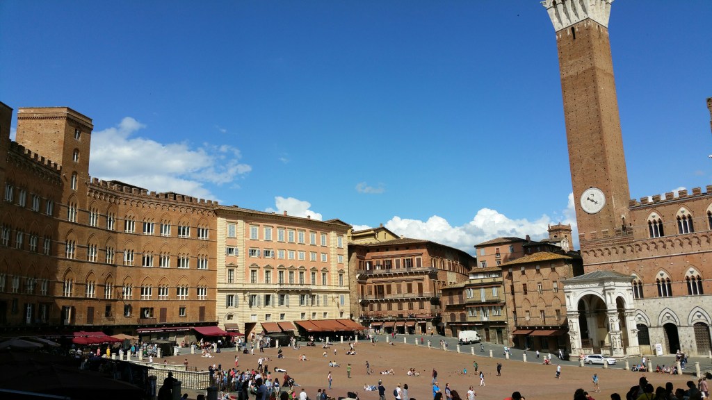 Siena sta asezata pe trei dealuri, iar inima acesteia o reprezinta Piazza del Campo, unul dintre cele mai frumoase locuri de aici. La orice ora din zi si din noapte, turisti si localnici deopotriva stau tolaniti pe pavajul pietei si privesc impunatorul Palazzo Pubblico cu frumosul sau turn, Torre del Mangia. Este o reala placere sa stai si sa ii observi de la una din numeroasele terase sau sa te integrezi printre ei si sa privesti spectacolul arhitectural din zari.