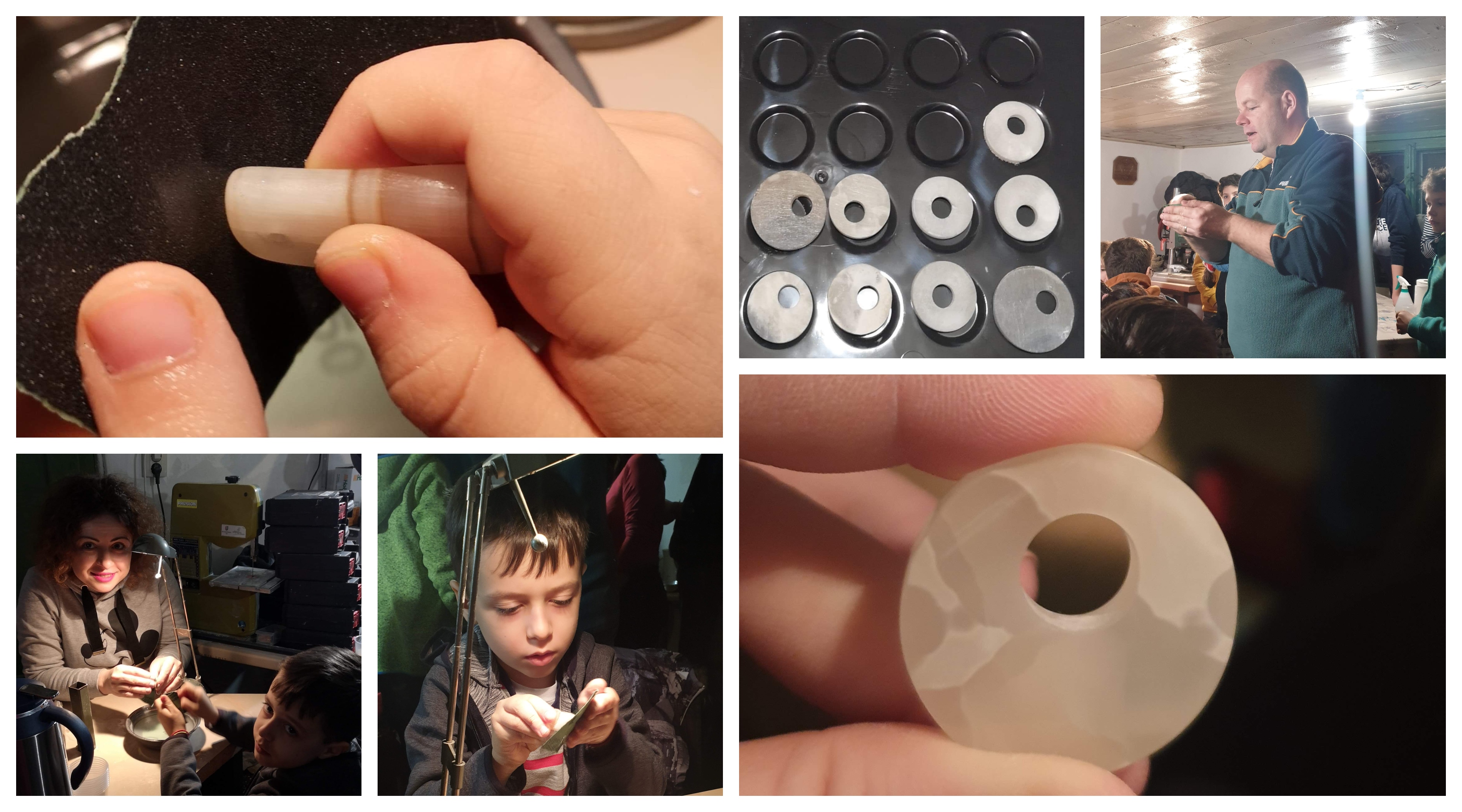 Dupa cina am avut parte de o noua surpriza: un atelier de manufactura de bijuterii din aragonit, acasa la Zoltan, ce ne-a fost si ghid duminica. In micul sau atelier, Zoltan ne-a initiat in tehnicile de prelucrare a pietrei si pe parcursul a aproape doua ore am prelucrat aragonitul de Corund pentru a ne realiza o bijuterie. Am parcurs patru etape de slefuire a pietrei si una de lustruire (folosind diferite tipuri de smirghel: de la cel mai abraziv, pana la unele extrem de fine). La final rezultatul a fost pe masura asteptarilor si am plecat acasa cu un medalion de toata frumusetea :). Pe durata atelierului ne-am delectat cu ceai cald si vin fiert, cu dulciuri, dar si cu un foc de tabara, sarbatorind astfel sfarsitul unei zile perfecte pe meleaguri transilvanene.