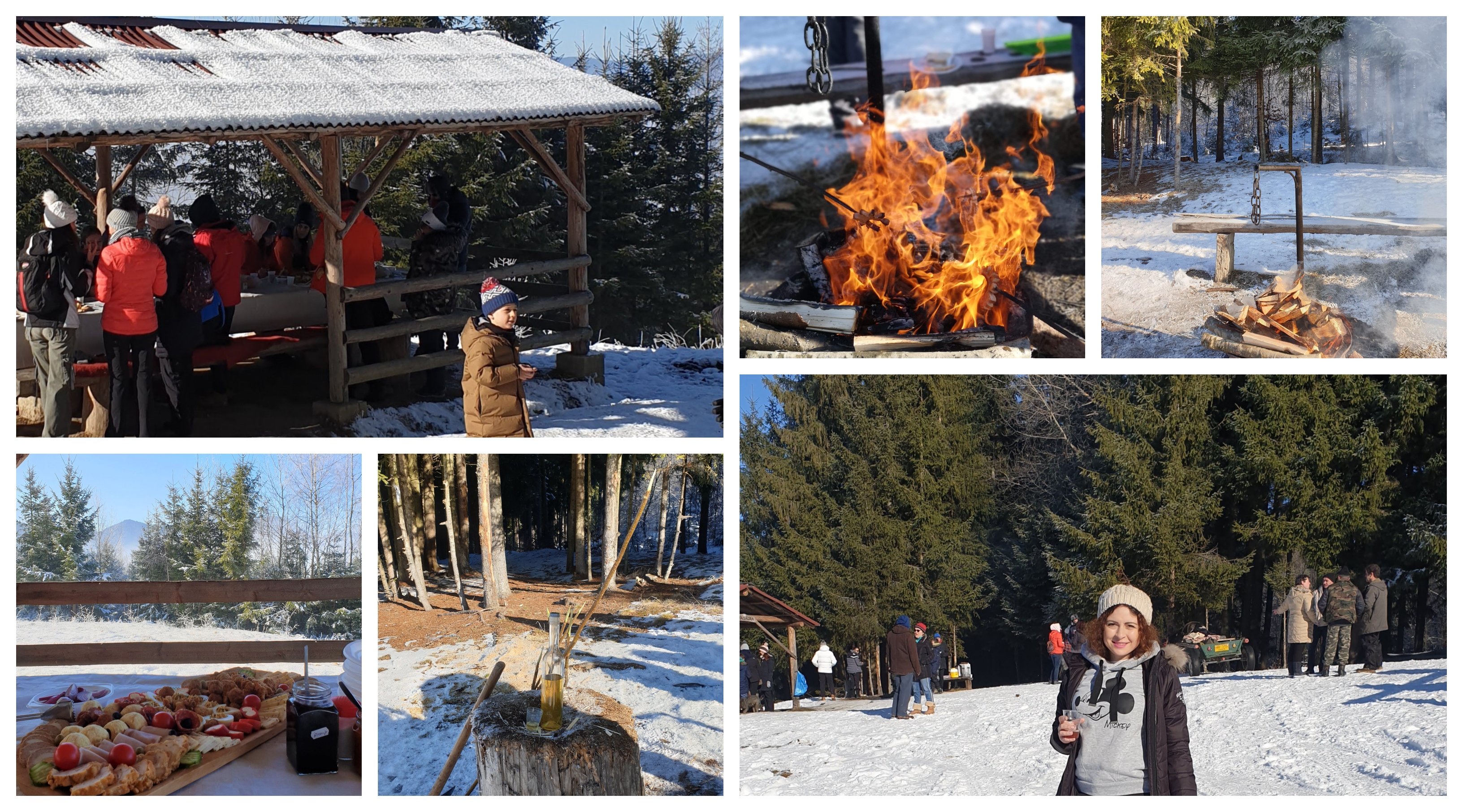 Odata ajunsi sus, am descoperit un platou absolut incantator, in mijlocul caruia am servit un picnic rece, cu mancare bio. Ne-am delectat cu slanina si jumari, branzeturi facute in casa, chec si tot felul de bunatati care mai de care mai apetisante, toate insotite de vin fiert, ceai cald si un foc de tabara numai bun pentru a perpeli putin bucatile de sunca :).