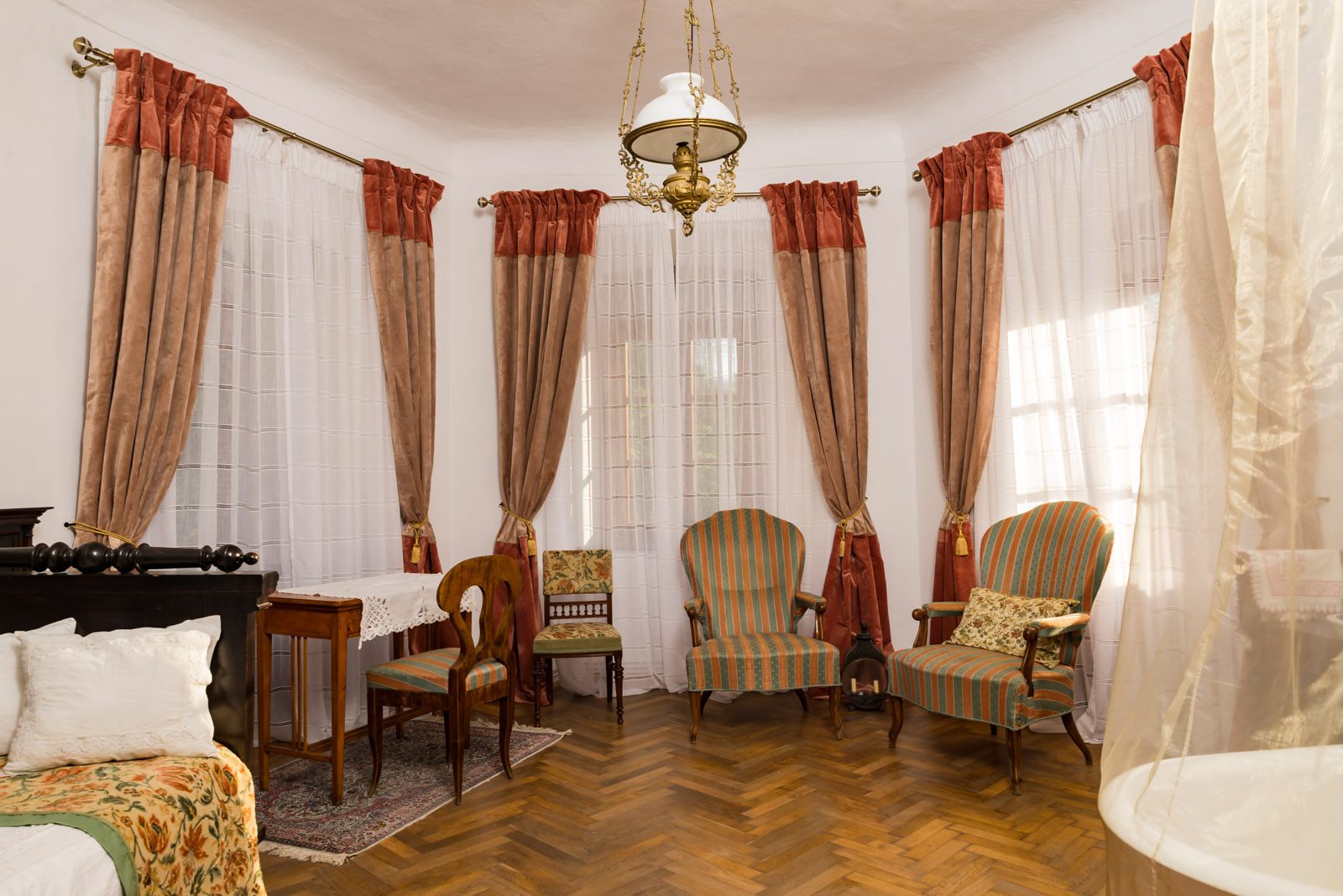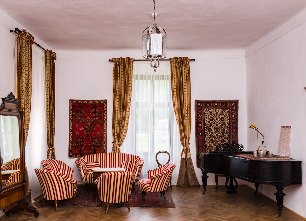Interiorul conacului este amenajat tip vagon, fiind prevazut cu cinci saloane in care se trece dintr-unul in altul, plus inca doua incaperi laterale, in capete, toate decorate in stiluri diferite. Turul nostru a inceput in Salonul Biedermaier, ce a primit numele de la mobilierul expus, tipic primei parti a secolului 19. Aici poti admira pianul Streicher original (acelasi model pe care il folosea si Johannes Brahms), dar si o soba verde foarte frumoasa ce a fost reconstruita (ca de altfel toate sobele conacului) de un mester din Bicfalau.