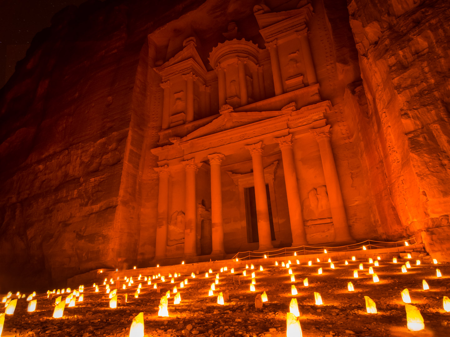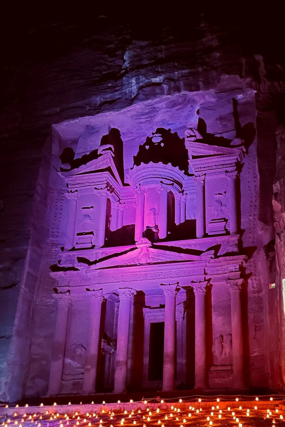 Seara noastra s-a incheiat monumental, cu Petra by Night, un mod magic de a descoperi a saptea minune a lumii. Am avut ocazia de a parcurge spectaculosul canion, intr-o liniste deplina, calauziti doar de lumina miilor de lumanari perfect aliniate pe marginea drumului. Imagineaza-ti ca este intuneric bezna, nu vezi nimic de-o parte si de alta, doar candelele aprinse care te poarta catre punctul culminant al Petrei, Trezoreria.