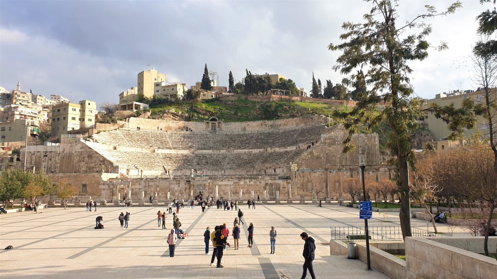 Urmatorul obiectiv pe lista noastra a fost Teatrul Roman, o constructie grandioasa, ce putea acomoda pana la 6.000 de persoane simultan. Acesta dateaza din timpul domniei lui Antonius Pius (secolul 2 i. Hr.) si spre deosebire de alte teatre romane care sunt construite din temelii, teatrul din Amman a fost sculptat pe versantul dealului, fiind proiectat catre nord, astfel incat spectatorii sa fie protejati de soare.