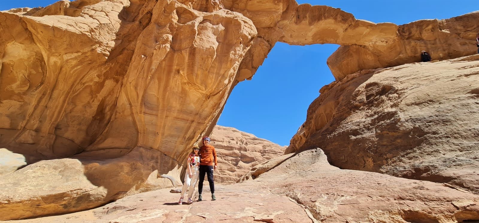 De indata ce am ajuns aici am fost intampinati de doi beduini simpatici care ne-au calauzit intr-o drumetie spectaculoasa timp de trei ore. Ne-am bucurat de peisaje selenare, de unicitatea reliefului, de oaze incantatoare cu verdeata, de liniste desavarsita, de soare si ne-am catarat pe stanci pentru cele mai frumoase fotografii. Am servit chiar si un ceai preparat pe loc, la foc aprins din vegetatie uscata, in timp ce ne-am delectat cu povestile beduinilor. A fost tare frumos!