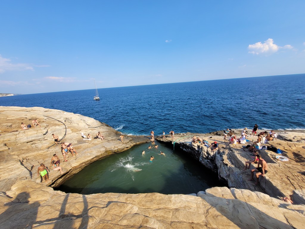La Giola nu exista nici plaja si nici umbra, asa ca nu este deloc confortabila daca vrei sa petreci prea mult timp. Este recomandata doar celor care vor sa sara in apa sau celor pasionati de fotografie. Eu ma incadrez in cea de-a doua categorie, insa baietii s-au distrat de minune😊.